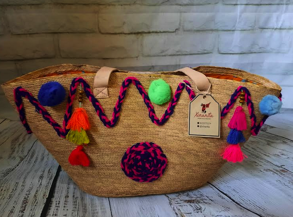 Bolsa cosida a máquina en palma con bordado multicolor a mano.