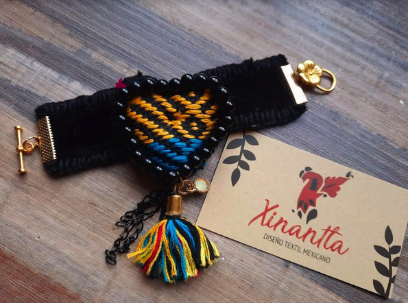 Brazalete en terciopelo con corazón bordado en azul y amarillo.