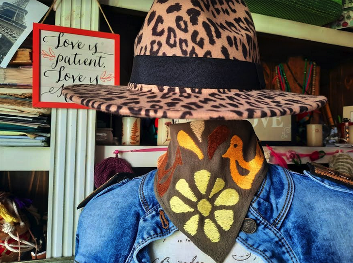 Pañuelo en algodón gris con bordado en tonos otoñales. Bordado libre.
