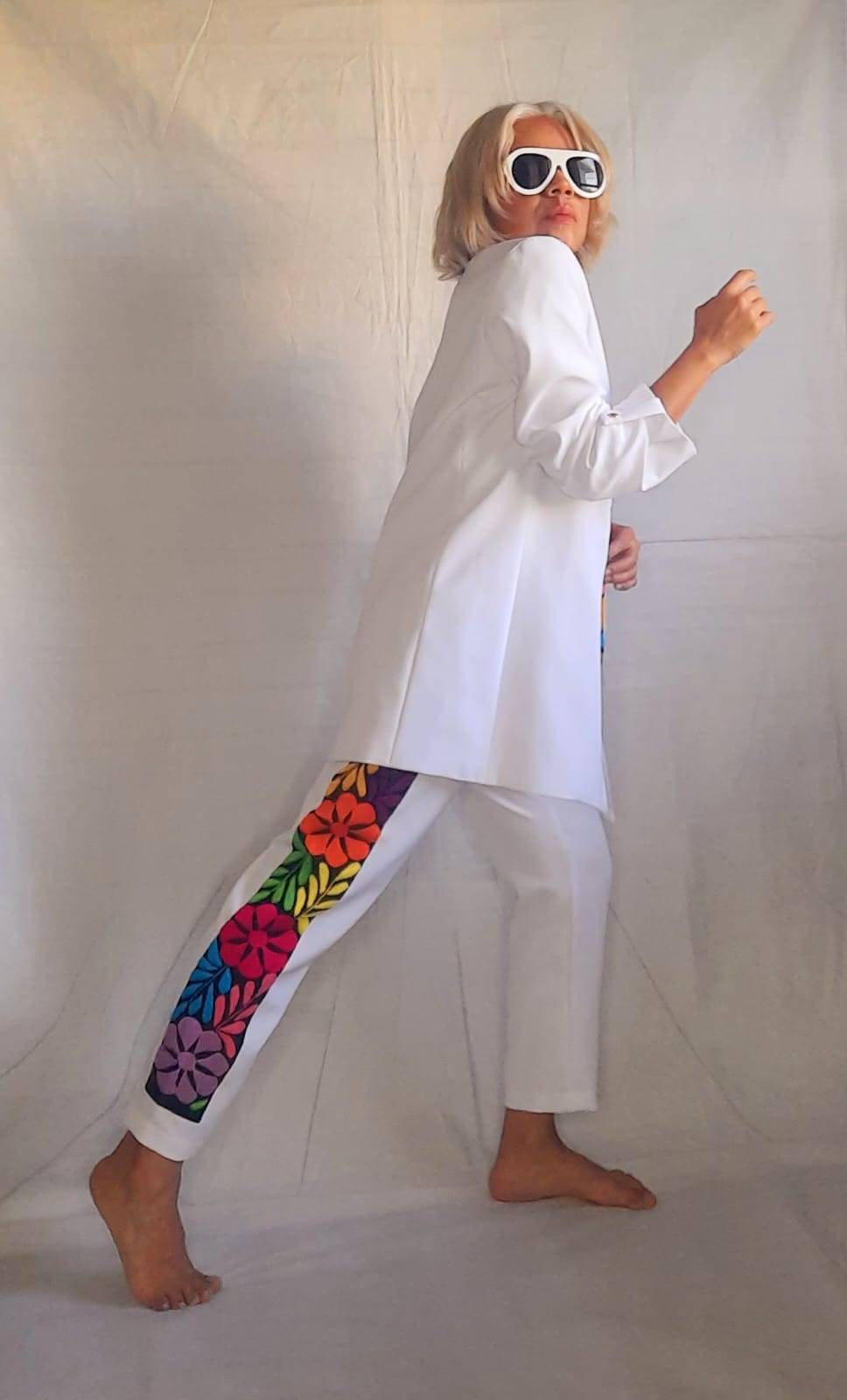 Pantalón confeccionado en crepé con spandex con bordado lateral multicolor.